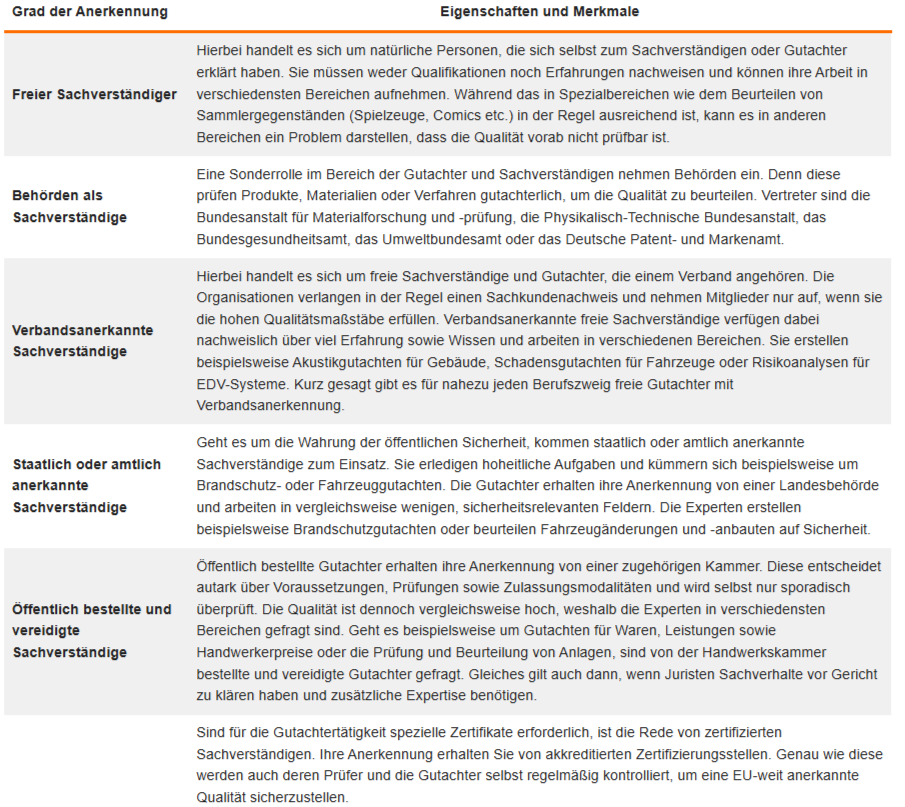 Wie bereits erwähnt, ist die Bezeichnung rechtlich nicht geschützt, wodurch sich theoretisch jeder Bürger als Gutachter oder Sachverständiger betiteln kann. Da das in der Praxis aber zu Falschaussagen, Fehlurteilen und anderen schweren Folgen führt, gibt es verschiedene Grade der Anerkennung. In Deutschland unterscheidet man zwischen freien, behördlichen, verbandsanerkannten, öffentlich bestellten und vereidigten, amtlich oder staatlich anerkannten und EU-zertifizierten Sachverständigen / Gutachtern. Die folgende Tabelle zeigt, worin sich die verschiedenen Kategorien unterscheiden.