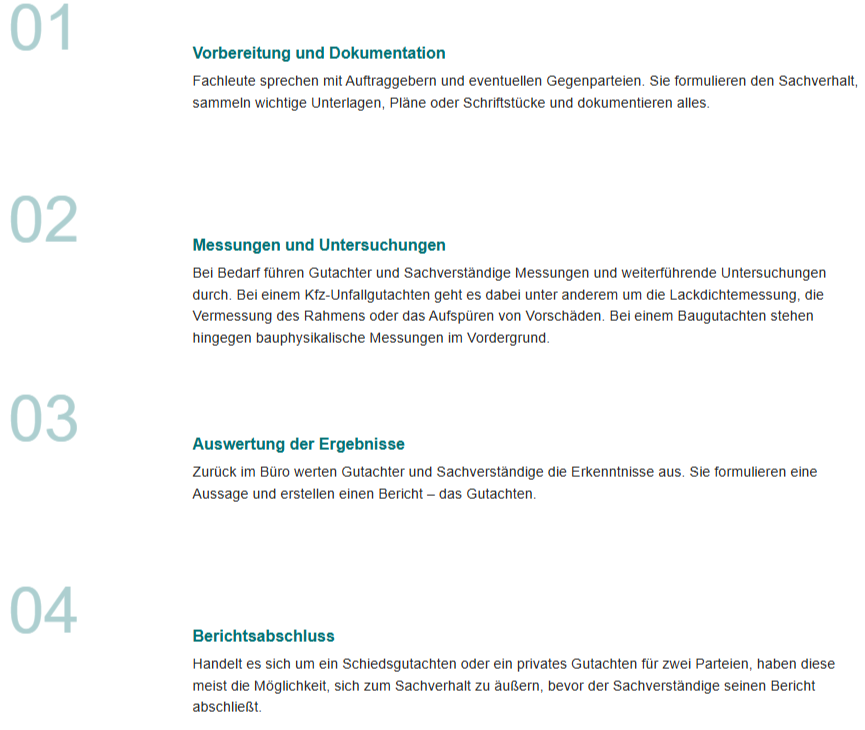 Wie Fachleute bei der Erstellung von Gutachten und Stellungnahmen vorgehen, hängt immer auch vom individuellen Fachbereich und dem jeweiligen Auftrag ab. In der Praxis hat sich allerdings ein Vorgehen bewährt, das auf folgenden 4 Schritten basiert