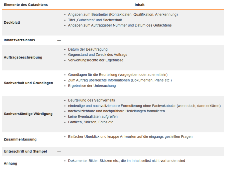 Ein Gutachten soll fundiert und einfach verständlich sein. Wichtig sind daher ein logischer Aufbau und eine übersichtliche Gliederung. Der Inhalt ist auf das Wesentliche zu reduzieren und alle Ergebnisse sowie Schlussfolgerungen müssen nachvollziehbar und begründet sein. Erfüllen lassen sich diese Vorgaben unter anderem mit folgendem Musteraufbau, der alle wichtigen Elemente eines Gutachtens enthält.